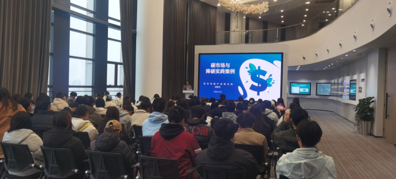 在随后的专业分享环节,武汉双碳产业研究院副院长梁胜文以“碳市场与降碳实践案例”为题,结合典型案例展开深度讲解。她从全球气候变化切入,详细阐释了全国碳市场的建设历程,介绍了碳资产注册登记、配额分配、履约清缴等核心业务的运作逻辑,重点介绍了湖北在碳普惠、气候投融资等领域的创新实践,并对未来全国碳市场的发展做出展望,为同学们的专业学习提供了明确指引。活动尾声,同学们结合课堂所学的碳市场、碳资产知识,围绕碳金融岗位需求、职业能力储备等方向,与现场工作人员展开交流探讨。大家纷纷坦言,此次走进中碳登大厦的实习,不仅直观触摸到了全国碳市场的实际运作场景,更真切感受到 “一栋楼就是碳产业链” 的产业活力,收获远不止课本知识的延伸。