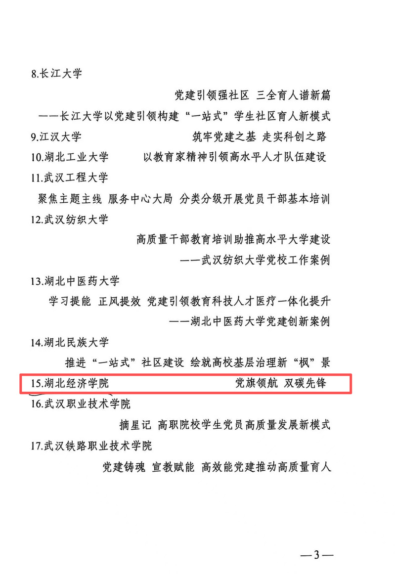 近日,湖北省高等学校党建研究会公布高校党建创新优秀案例名单,全省有63所高校87个案例申报,最终评选了40个优秀案例,其中一等奖5个,二等奖15个,三等奖20个。我院威廉希尔williamhill党建创新案例——“党旗领航 双碳先锋”荣获二等奖。